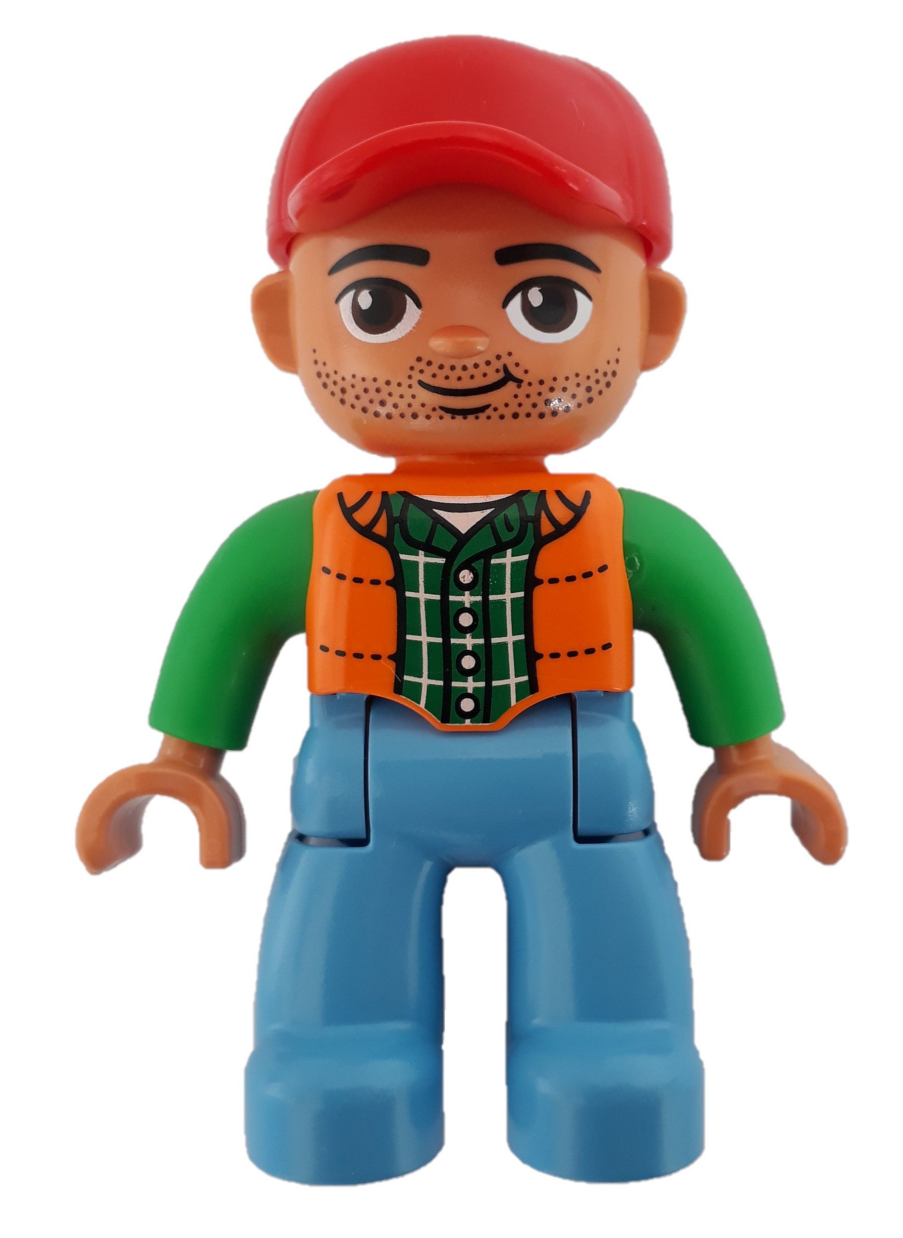 Boneco Masculino Lego Duplo Colete Laranja, Camisa xadrez Verde Escuro, Boné Vermelho.