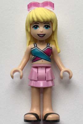 Friends Stephanie, saia em camadas rosa brilhante, blusa de maiô magenta e azul médio, óculos de sol